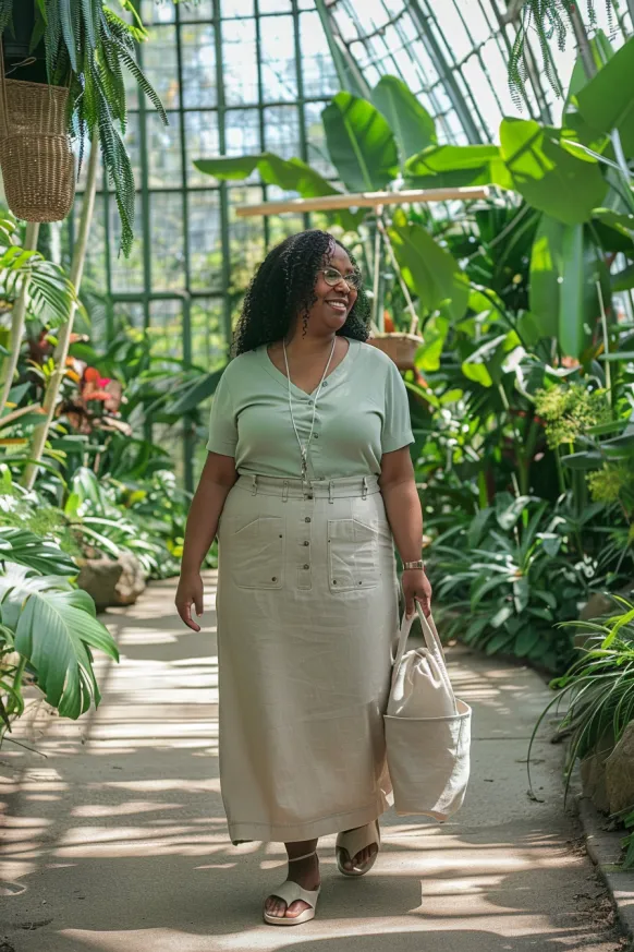 This outfit is a breezy blend of comfort and charm, perfect for sunny strolls or casual outings. The soft sage green V-neck tee keeps things fresh and relaxed, while the high-waisted beige midi skirt brings just the right amount of structure with its front buttons and oversized pockets. Slide-on sandals and a canvas tote complete the look without trying too hard. There’s a lovely balance between fitted and flowy here that flatters beautifully without sacrificing comfort.