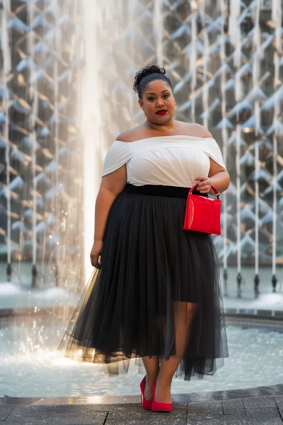 I’m completely obsessed with how dramatic yet wearable this outfit feels. It’s giving ballerina-meets-city-goddess, and I’m here for it. The tulle skirt makes me want to twirl like nobody’s watching, and those red accessories? They add just enough sass. I’d rock this for a fancy summer dinner, a gallery opening, or honestly, just when I want to feel fabulous walking past a fountain like it’s my runway.