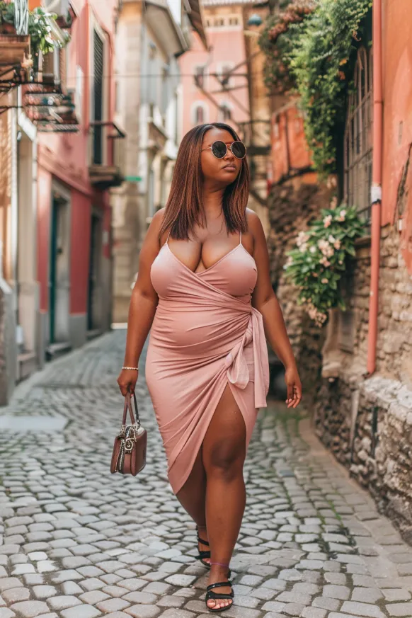 This outfit is the definition of summer sass with a whole lot of confidence. The wrap-style dress hugs all the right curves and features a gorgeous front-tie detail that adds just enough texture. The deep neckline and high slit keep things breezy and bold, while the soft blush color brings a romantic vibe. Styled with black strappy sandals, oversized sunglasses, and a mini structured handbag, it’s giving city break realness in the cutest way.