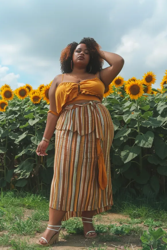 This outfit is all about earthy tones and sunshine vibes. The mustard yellow crop top has a playful tie front and thin straps that keep things cool and breezy. Paired with a striped midi wrap skirt featuring warm rust, amber, and caramel tones, it creates the kind of boho-chic look that belongs in a field of sunflowers. The little tassel detail adds just the right amount of personality, while white strappy heels elevate the whole look in a really effortless way.