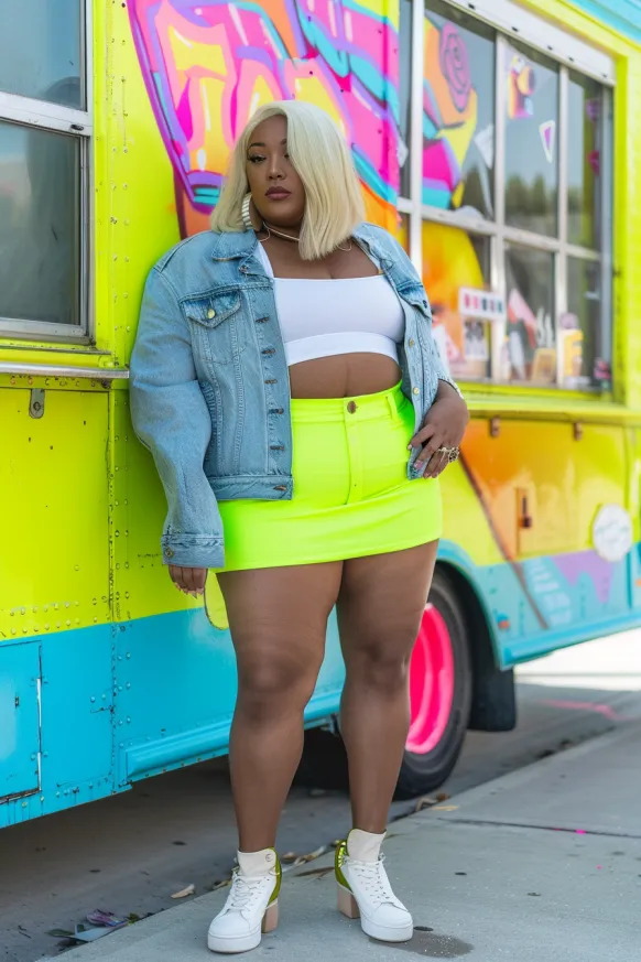 This outfit is bold, bright, and made for showing up with confidence. The neon yellow mini skirt is the clear star of the show, hugging curves and commanding attention. Paired with a crisp white crop top and an oversized denim jacket, it strikes that perfect balance between casual and fierce. Chunky white sneakers and a sleek blonde bob round out the look with major cool-girl energy.