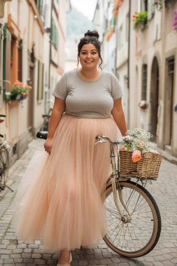 This look is the perfect mix of dreamy and down-to-earth. The standout piece is the long blush tulle skirt that brings all the fairy-tale flow with every step. It’s paired effortlessly with a tucked-in gray t-shirt that keeps the vibe relaxed and low-key. The look is finished off with comfy flats and a charming bike basket full of flowers that might as well be the accessory of the season.