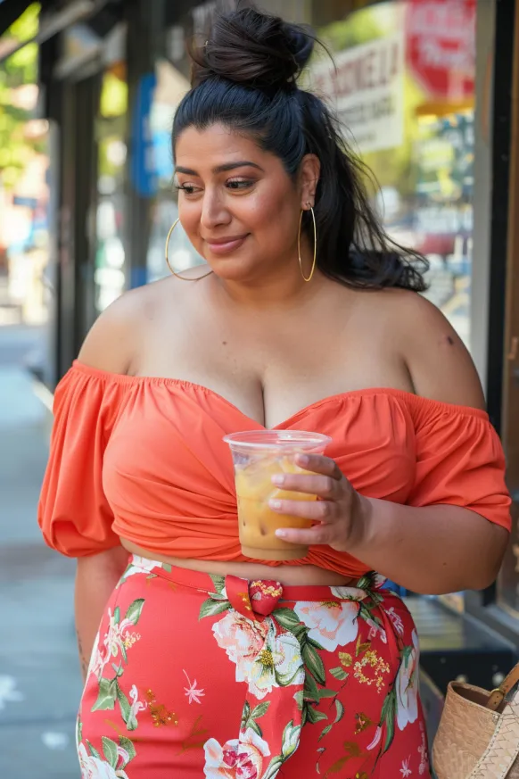 This outfit is giving tropical goddess energy in the best way. The coral-toned off-shoulder crop top is soft and flirty with a ruched front that flatters without fuss. It’s paired with a matching floral wrap skirt that ties at the waist and hugs the hips just right. The whole look is light, breezy, and basically made for iced coffee runs, patio brunches, or any sunny stroll through the city.