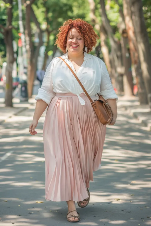 This outfit is summer sweetness wrapped in soft pastels. The look pairs a classic white button-down shirt, loosely knotted at the waist, with a flowy blush pink pleated skirt that twirls with every step. The skirt hits right at the ankle and has a breezy, romantic vibe that’s just made for strolling tree-lined streets. Sandals and a caramel crossbody bag keep things comfy and cute, while the overall look stays polished but totally relaxed.