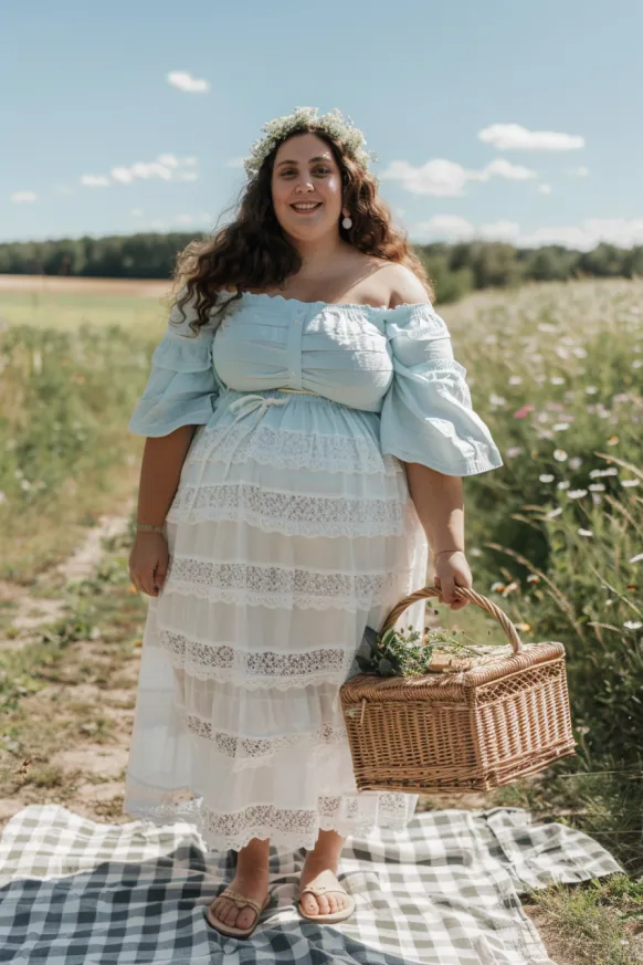 This outfit is a dreamy picnic fantasy come to life. The off-shoulder puff sleeve top in soft powder blue brings gentle charm, perfectly paired with a flowing white lace maxi skirt that twirls with every breeze. Delicate lace panels and a lightweight fabric make the look feel light as air. The floral crown and woven picnic basket give it that extra fairy-in-a-meadow touch, while simple sandals keep it grounded and comfy.
