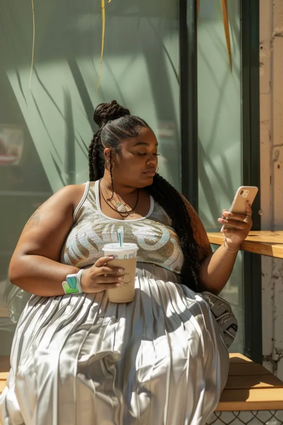 This outfit is a chill-meets-chic summer look with just the right amount of sparkle. The metallic pleated maxi skirt flows effortlessly and catches the light with every movement. Paired with a silver-toned tank that features a fun swirl pattern, the look stays playful while serving serious cool-girl energy. Layered necklaces, statement accessories, and an iced drink in hand make it feel totally lived-in and real.