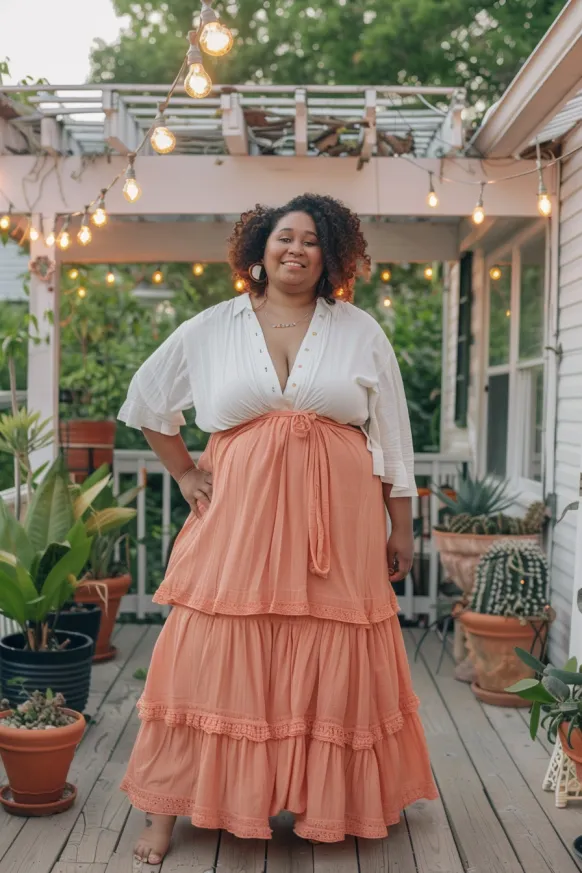 This outfit is giving laid-back elegance with a boho soul. The soft terracotta tiered maxi skirt steals the show with its layered detail and comfy tie waist. Paired with a flowy white blouse that features a flattering V-neck and relaxed sleeves, it creates a balanced silhouette that’s as breezy as a summer night on the porch. The overall look feels effortless, earthy, and totally charming under twinkle lights.