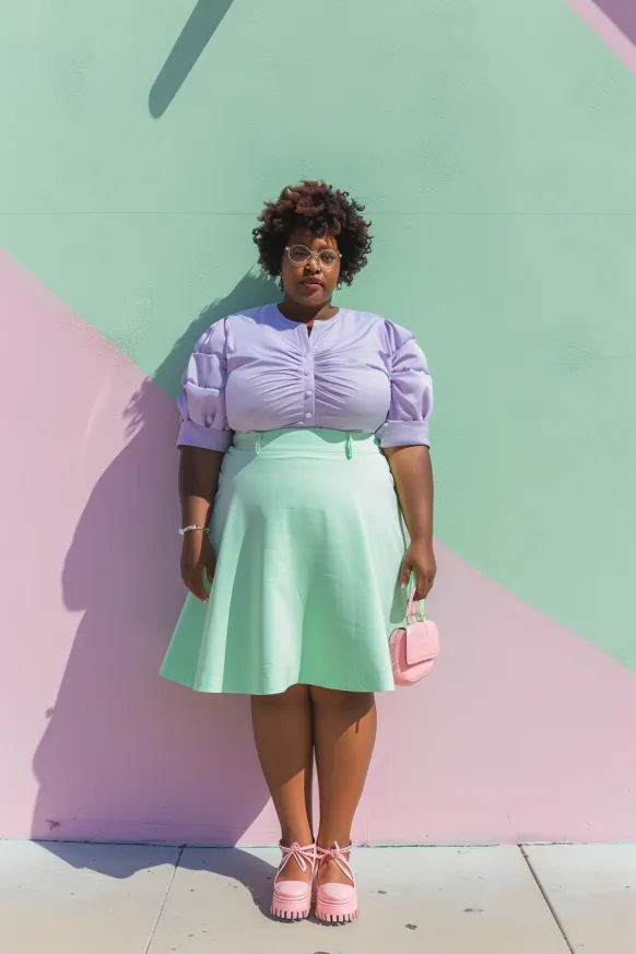 This outfit is pastel perfection from head to toe. The mint green skater skirt adds a playful twirl with just the right amount of flare, while the ruched lavender blouse brings in a touch of vintage charm with its puff sleeves and fitted silhouette. Soft pink accessories, from the mini handbag to those adorable lace-up platform shoes, tie the whole look together like candy on a summer day.