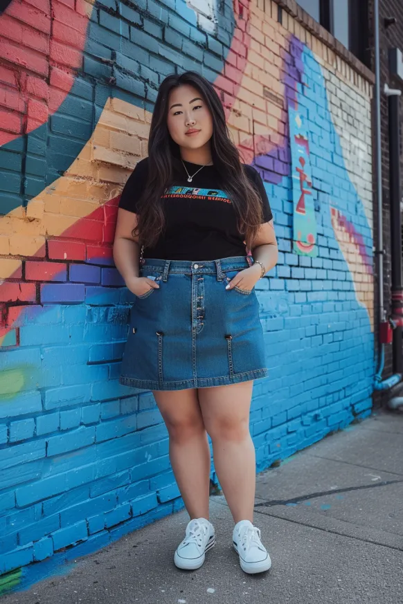 This outfit keeps it simple but full of personality. A dark-wash button-front denim skirt sits just above the knees with a structured A-line shape that flatters the figure and adds a bit of retro flair. It’s paired with a black graphic tee tucked in just enough to show off the high-waisted fit. The look is topped off with classic white sneakers and minimal accessories, making it feel chill, modern, and totally street-style ready.