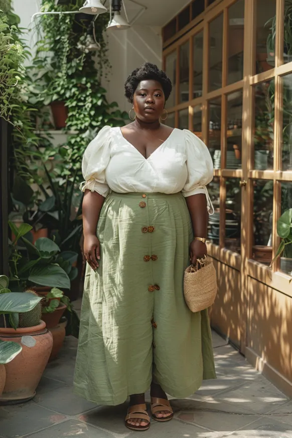 This outfit is like a soft summer breeze you can wear. The look features a puff-sleeve blouse in crisp white cotton with a flattering V neckline and tie details at the sleeves. It’s tucked into a sage green button-front skirt that hits around mid-calf and flows beautifully with its relaxed, airy shape. The natural wooden buttons down the front add a sweet, earthy touch. Paired with brown sandals and a woven straw handbag, this whole look feels like a weekend stroll through a botanical garden.