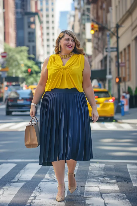 This outfit is all about bold color and elegant structure. A sleeveless mustard yellow blouse with a soft front twist detail brings the sunshine, while a deep navy pleated midi skirt adds the perfect contrast. The pleats give it movement and grace with every step, and the outfit is finished with neutral heels, a structured handbag, and statement jewelry for that polished, downtown-ready vibe. It’s giving smart, stylish, and totally unstoppable energy.