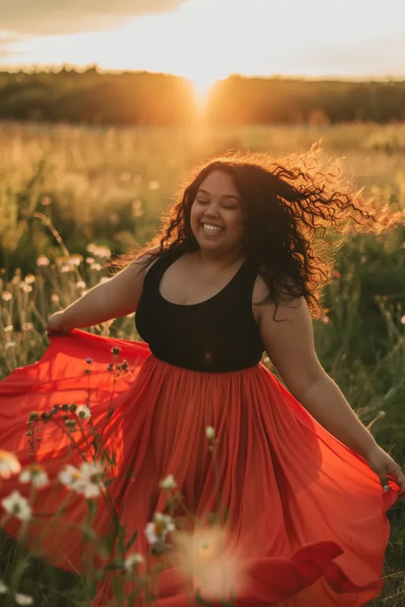 Sunset Glow in a Flowing Red Skirt