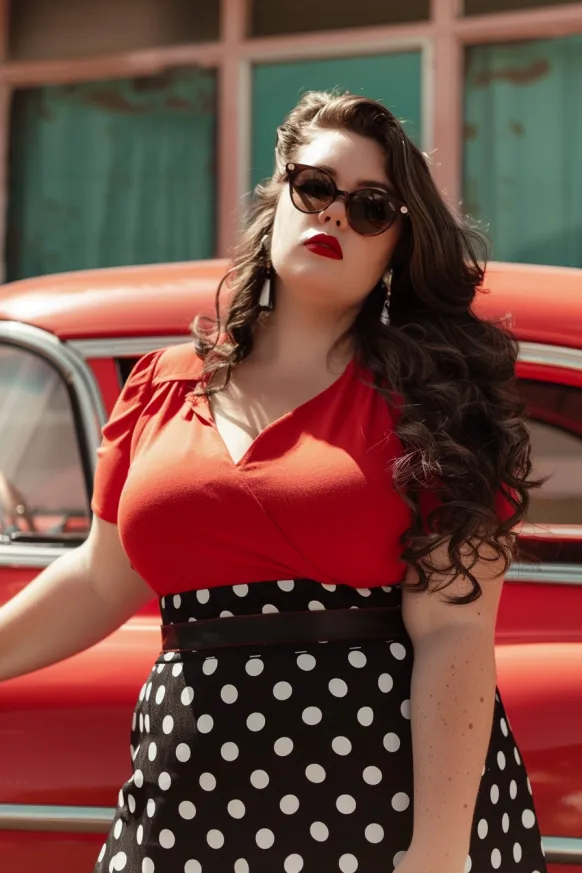 This outfit is pure vintage magic. The look features a bold red V-neck top with soft gathering at the shoulders that gives it that perfect old-Hollywood charm. It’s paired with a high-waisted black skirt dotted with oversized white polka dots, cinched in with a sleek black waistband that hugs the curves just right. Statement earrings, voluminous curls, red lipstick, and classic cat-eye sunglasses complete the pin-up inspired vibe with serious confidence.