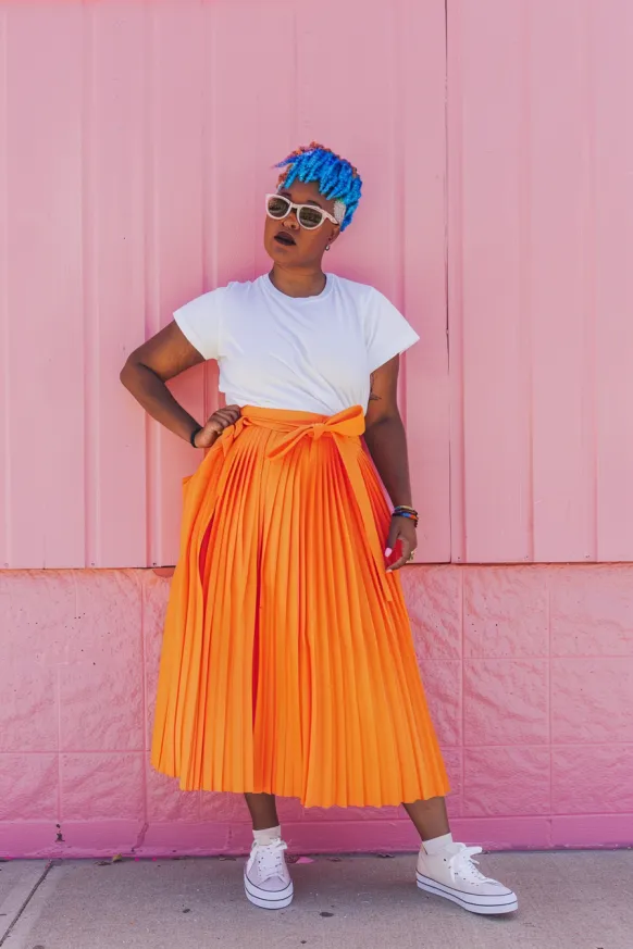 This outfit is sunshine in motion. A crisp white tee keeps things classic on top, while the star of the show is that vibrant orange pleated midi skirt tied at the waist with the cutest bow. The pleats add movement and drama in the best way, and pairing it with chunky white sneakers makes the whole look feel fun, comfy, and totally wearable. Add in those funky white sunglasses and you’ve got an instant mood-lifter.