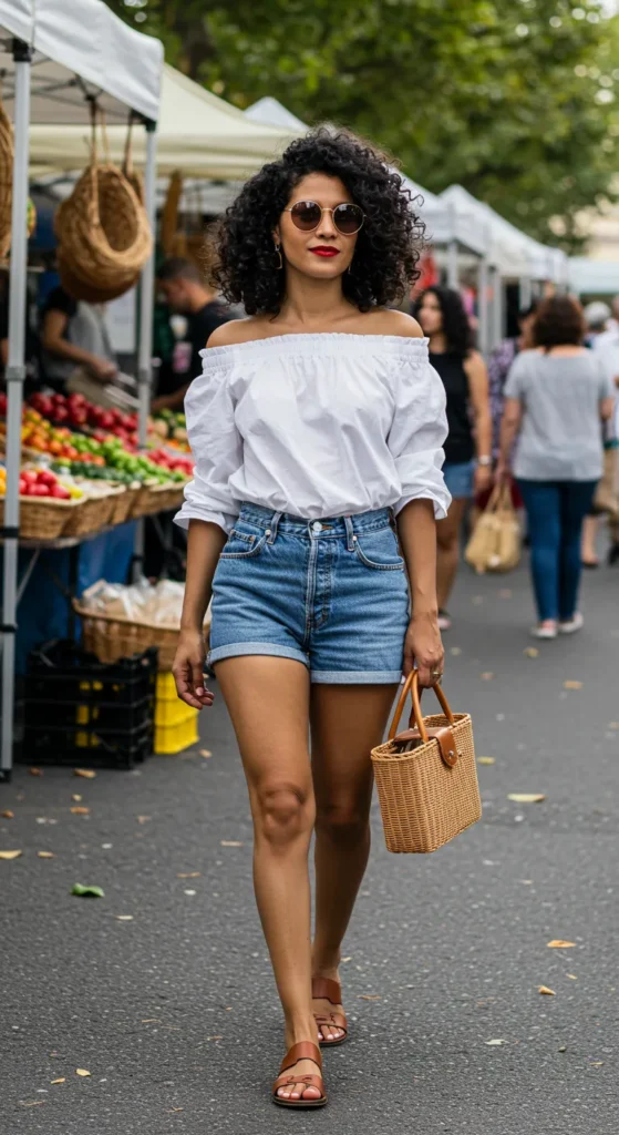 This effortlessly chic summer look is perfect for a day out at the market. The outfit features a loose, off-the-shoulder white blouse paired with high-waisted denim shorts, creating a laid-back yet stylish vibe. Comfortable brown sandals and a cute woven basket bag complete the look. With her natural curls and stylish sunglasses, this outfit screams both comfort and elegance.
