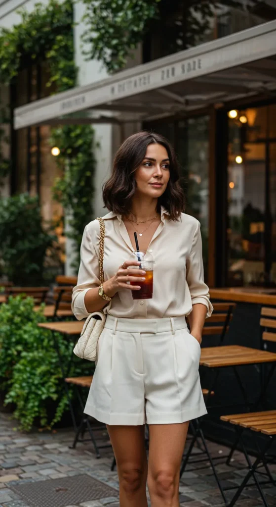 This chic outfit combines sophistication with casual comfort, making it perfect for a day out in the city. The model wears a cream-colored button-down shirt tucked into tailored beige shorts, creating a polished yet relaxed look. The beige and cream palette is elevated with subtle gold jewelry, and the model accessorizes with a stylish white handbag. With her iced coffee in hand and sunglasses on, this outfit screams effortless summer elegance.