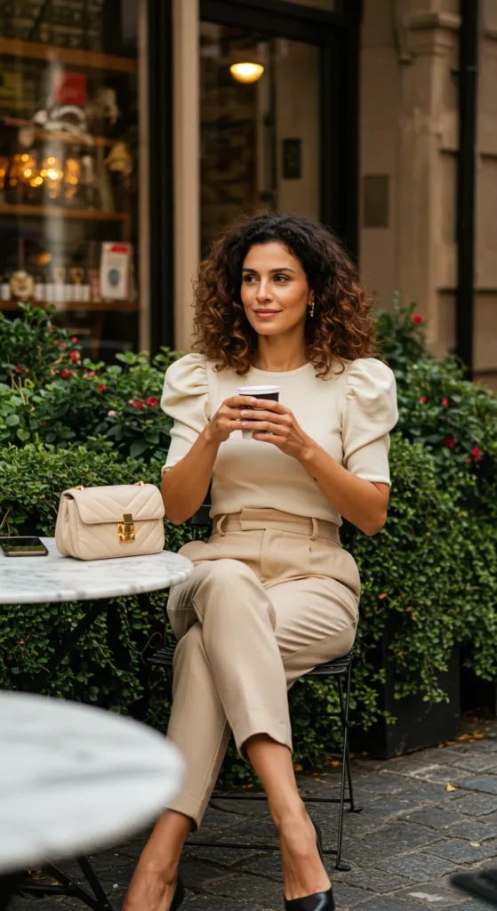 This outfit is pure sophistication, built around a beautiful palette of neutral creams and beiges. The star is a lovely cream-colored top with the cutest short puff sleeves, adding a touch of playful volume. It’s paired perfectly with high-waisted, tailored trousers in a coordinating beige shade that looks smart and polished. Classic black pointed heels add a sharp contrast and elevate the look, while a chic quilted cream bag with gold details ties everything together beautifully.