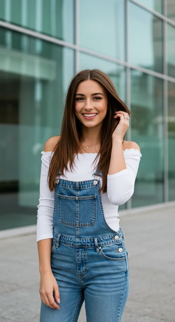 This look is bringing back overalls in the cutest way possible! We’ve got a classic pair of blue denim overalls, the kind with the bib front and adjustable straps, giving off major fun and casual vibes. Underneath, she’s rocking a crisp white off-the-shoulder top. The top looks like it’s made from a comfy ribbed material and has long sleeves, adding a sweet, slightly romantic touch to the sturdy denim. The accessories are kept simple with just a delicate necklace.