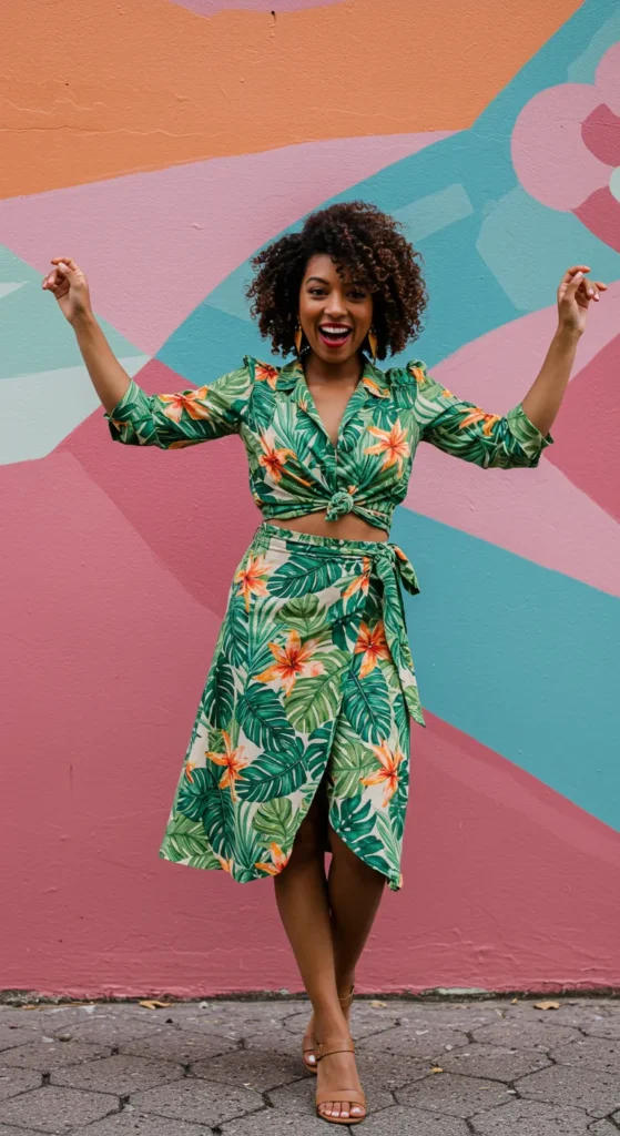 Get ready to turn heads with this amazing tropical print two-piece set! It’s bursting with color, featuring big green palm leaves and bright orange flowers. The outfit consists of a super cute cropped top with a collar and three-quarter sleeves, cleverly tied at the front for a fun, flirty feel. It’s perfectly matched with a wrap-style skirt that hits around the knee and ties at the side, showing just a little leg. Tan heeled sandals and some statement earrings complete this totally joyful look.