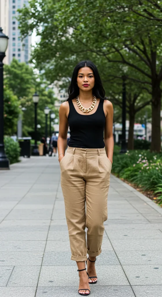 I absolutely love how this look effortlessly combines style and comfort. The black tank is a wardrobe staple, and the beige trousers give it an elevated, modern touch. The chunky gold necklace adds a pop of glam, making it the perfect accessory for this neutral-toned outfit. Whether you’re strolling through the city or grabbing lunch with friends, this outfit says “I’m stylish and I know it!” It’s perfect for anyone looking for that chic yet casual vibe that works for so many occasions.