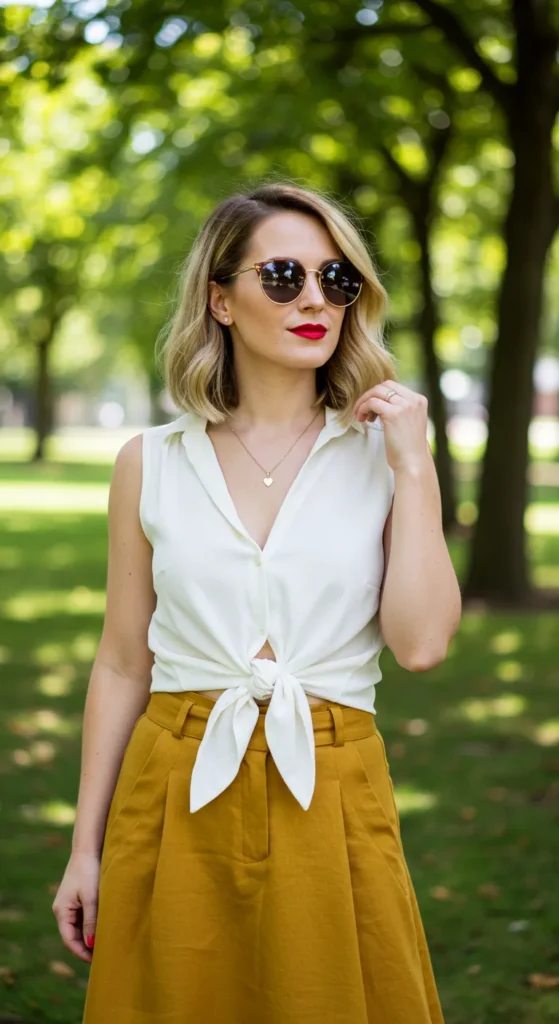 This outfit just screams sunshine and picnics in the park! It features a crisp white sleeveless button-down shirt, cleverly tied at the front to cinch the waist and add a playful touch. This is paired beautifully with a high-waisted midi skirt in a gorgeous warm mustard yellow. The skirt looks like it’s made from a lovely breathable fabric, perfect for warmer weather, and has a flattering A-line cut. Chic round sunglasses and a pop of bright red lipstick complete this stylish look.