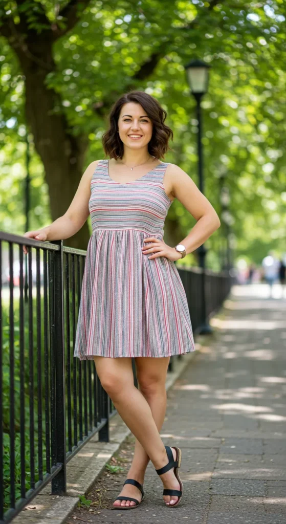 This outfit is all about effortless summer style, centered around a cute sleeveless mini dress. It features a lovely mix of vertical stripes in soft reds, blues, and neutrals. The dress has a simple scoop neckline and a fitted, textured bodice that flows into a gently gathered skirt hitting just above the knee. She’s paired it perfectly with comfy black flat sandals, keeping the look super relaxed and practical for a day out.
