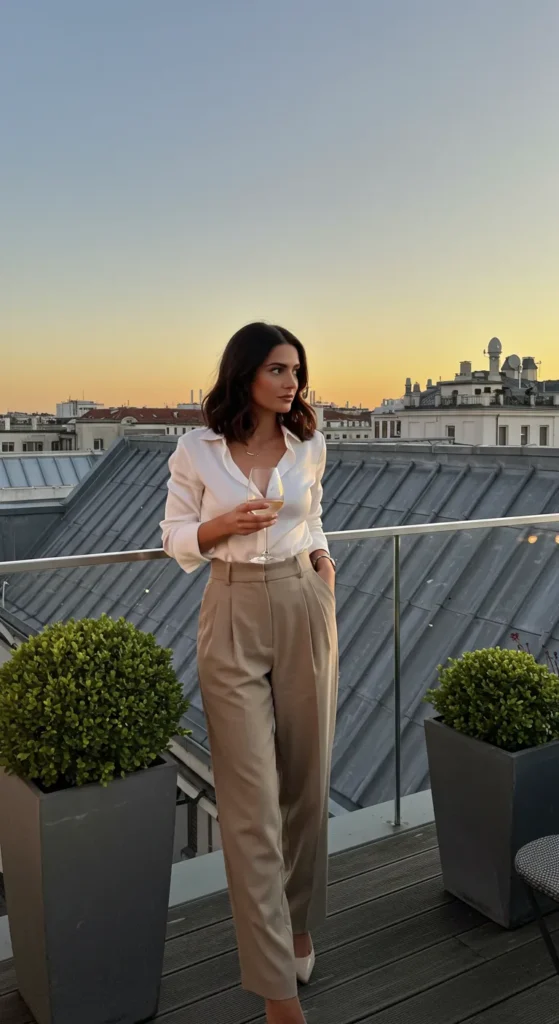This chic, sophisticated summer evening look is perfect for an upscale rooftop event or a sunset cocktail gathering. The outfit features a crisp white blouse, slightly unbuttoned for a relaxed yet polished vibe. Paired with high-waisted beige trousers, this look is a nod to timeless elegance. The model is holding a glass of wine, embodying a carefree yet classy vibe, while the golden hour glow adds to the overall luxe feel of the outfit.