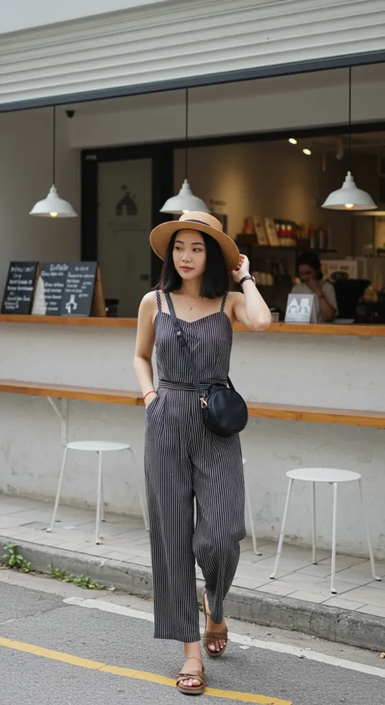 This stylish and comfy striped jumpsuit is perfect for a casual day out. The black and white vertical stripes elongate the legs while the relaxed fit ensures comfort. Paired with a wide-brimmed straw hat and a small black crossbody bag, this outfit exudes a cool, laid-back vibe. The strappy sandals complete the look, making it ideal for strolling around town or grabbing a coffee with friends.