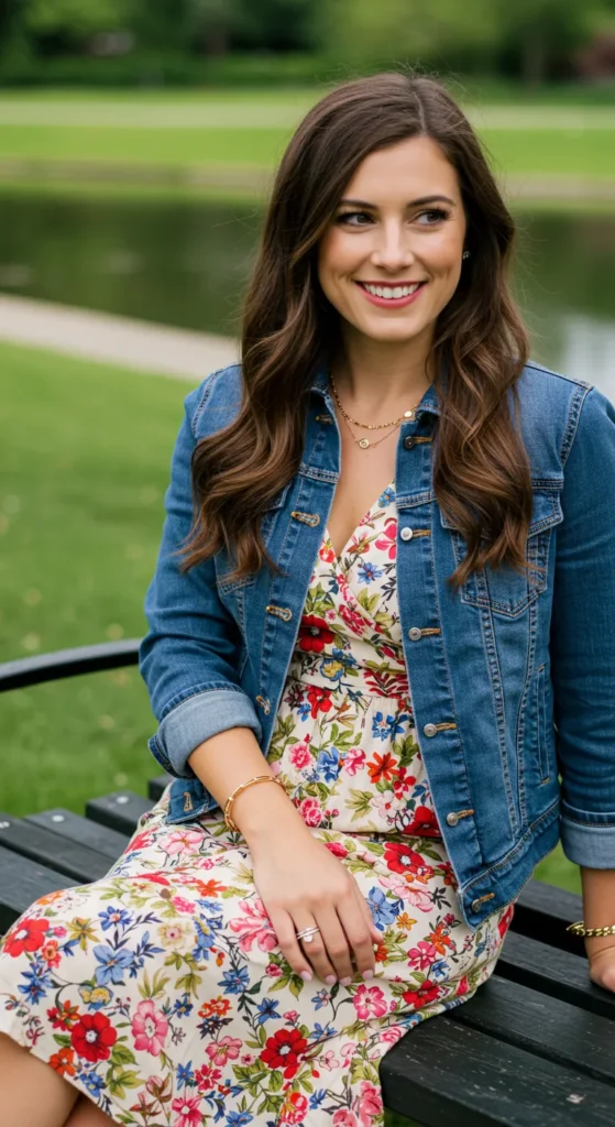 This cute summer outfit is perfect for a day out in the park or a casual brunch. The model is wearing a floral print dress with shades of red, blue, and green on a soft cream background, making it bright and cheerful. The dress is paired with a classic denim jacket, adding just the right amount of structure and warmth for cooler evenings. Her simple jewelry and soft, natural waves in her hair complete the look with a laid-back yet polished vibe.