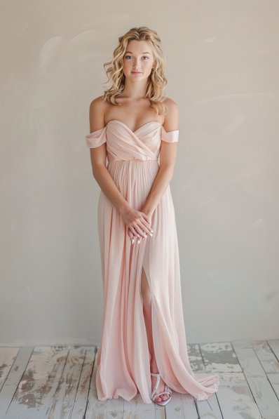 This dreamy blush-pink gown is pure romance in fabric form. The off-shoulder sweetheart neckline gracefully highlights the collarbones, while the delicate pleated bodice adds structure and sophistication. Its flowing, floor-length skirt features a subtle slit that’s perfect for a hint of allure, and the soft chiffon material moves beautifully with every step. Paired with minimal accessories and dainty heels, this dress is all about effortless charm.