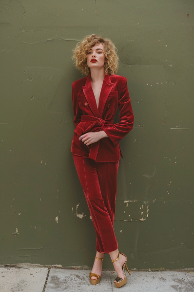 This deep red velvet suit is the ultimate blend of bold and chic. The tailored blazer features a waist-cinching tie that enhances your silhouette, while the matching straight-leg trousers offer a sleek and sophisticated finish. The plush velvet fabric adds richness and luxury, making it perfect for a Valentine’s dinner where you want to stand out. Paired with gold heels and a pop of red lipstick, this look is a true showstopper.