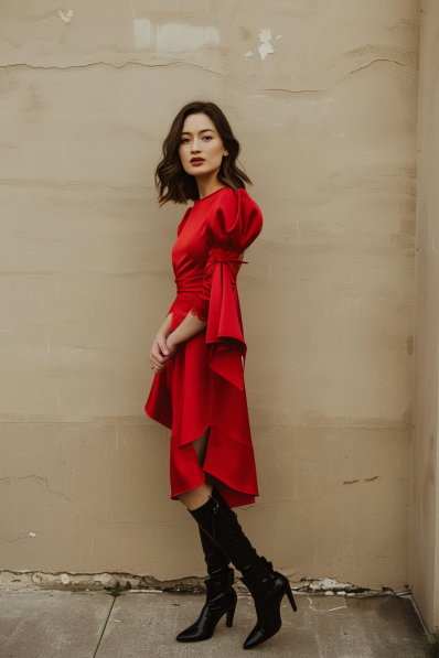 What makes this outfit so special is how it feels both fashion-forward and romantic at the same time. The red is the perfect choice for Valentine’s Day, and those statement sleeves? Total conversation starters. I also love how the boots give it an unexpected twist, adding a little edge to an otherwise elegant look. It’s the kind of outfit that lets you channel your inner fashionista while keeping things fun and flirty. Trust me, you’ll own the night in this!