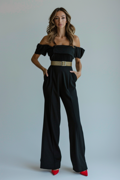 I’m obsessed with how this look combines comfort and glamour. The jumpsuit is so versatile—it’s dressy without feeling fussy—and the off-shoulder design shows just the right amount of skin. That gold belt? Instant elegance. And let’s not forget the red heels—they’re like the cherry on top, bringing the whole look together with a pop of romance. This is the outfit for when you want to feel classy, confident, and ready to slay the night!