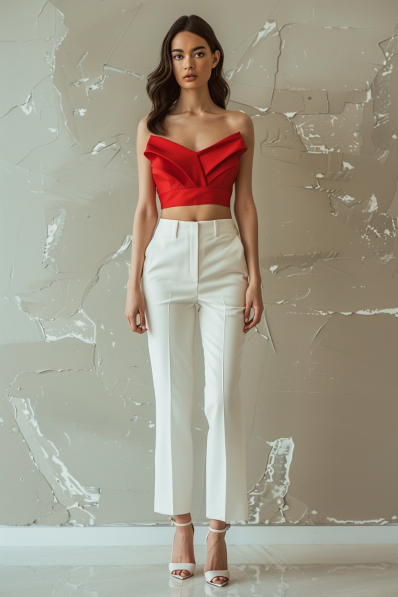 I’m absolutely loving how this look combines boldness and minimalism. The vibrant red top is all about making a statement, while the crisp white trousers keep it polished and refined. It’s chic, playful, and perfect if you’re going for a confident yet flirty vibe. This outfit feels modern and fresh, like something you’d wear to a fancy dinner while still keeping things fun and approachable. It’s giving major “modern romance” energy!
