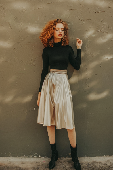 This black and satin pairing is effortlessly chic with a touch of vintage charm. The fitted black turtleneck top creates a sleek and polished silhouette, perfectly balancing the voluminous champagne satin midi skirt. The soft sheen of the skirt adds an element of luxury, while black ankle boots ground the look, giving it a modern and slightly edgy vibe. It’s the ideal choice for a Valentine’s dinner that feels elevated yet relaxed.