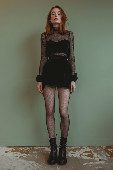 What I love about this look is its unapologetic attitude. It’s got that “I’m here to break hearts” energy while still feeling chic and stylish. The combination of textures—sheer, velvet, and fishnets—is so interesting and makes the outfit pop. Plus, the boots add a cool-girl edge that’s impossible to ignore. This is for someone who wants to feel powerful and a little rebellious on Valentine’s Day. A true statement outfit!