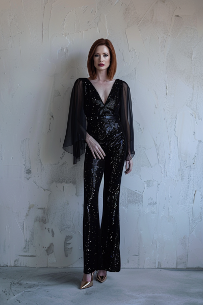 This dazzling black jumpsuit is a show-stopper for any Valentine’s dinner. The deep V-neckline adds a touch of allure, while the glittering fabric catches the light beautifully for an ultra-glam vibe. Flowing sheer sleeves bring a dramatic yet ethereal element, and the flared pant legs create an elongating silhouette. Paired with metallic heels, this look is pure sophistication with a hint of drama.