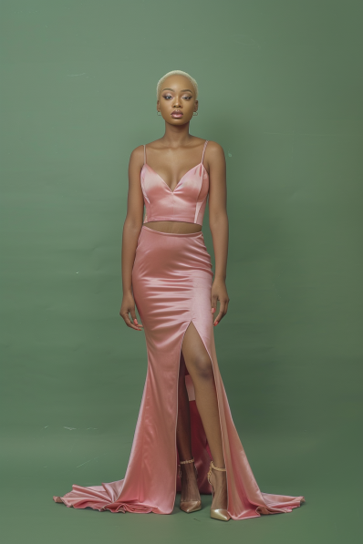 This stunning two-piece gown in a soft rose hue is the perfect blend of elegance and modern flair. The fitted satin crop top with spaghetti straps offers a sleek, contemporary vibe, while the matching high-waisted skirt features a dramatic thigh-high slit and an elegant train that cascades behind you. Paired with strappy gold heels, this look is all about turning heads at your Valentine’s dinner.