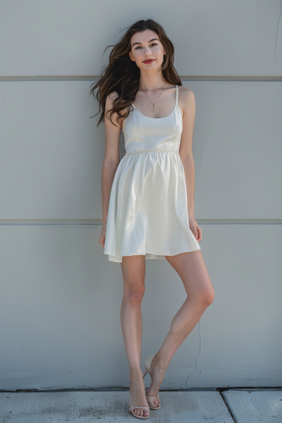 This white satin mini dress is all about playful elegance. The spaghetti straps and scoop neckline add a light, airy feel, while the gathered waist flatters your figure and creates a soft, flowing silhouette. The short hemline keeps it youthful and fun, making it ideal for a Valentine’s dinner that’s more casual yet still special. Paired with nude heels and a simple pendant necklace, this look radiates effortless charm.