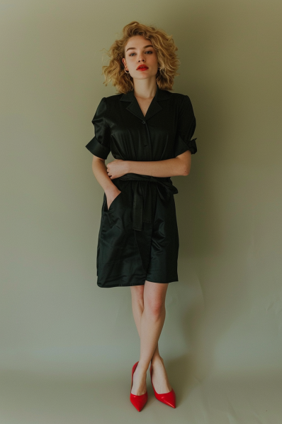 This black satin shirt dress is a modern take on timeless elegance. With its tailored collar, rolled sleeves, and a belted waist, it creates a structured yet relaxed silhouette. The satin finish adds a touch of luxury, and the knee-length hem keeps it chic and versatile. Paired with striking red heels, this outfit is effortlessly classy and perfect for a stylish Valentine’s dinner.