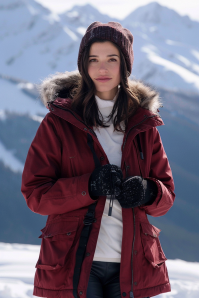This outfit screams winter chic with its deep red parka featuring a plush fur-lined hood that’s both practical and stylish. Paired with a sleek white turtleneck, the ensemble adds a clean, minimalist vibe under the warmth of the jacket. The knitted beanie in a matching tone brings everything together, while the black gloves add a touch of contrast and function for those frosty mountain adventures. The leather pants add a modern edge, giving off a “ready for anything” energy.