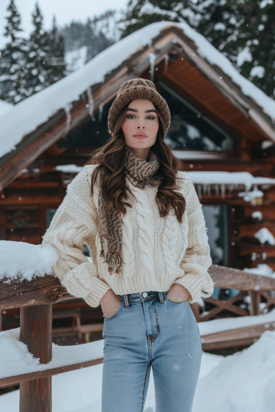 This outfit embraces cozy cabin vibes with a chunky cream cable-knit sweater that’s both classic and effortlessly chic. Paired with light-wash high-waisted jeans, it creates a relaxed and flattering silhouette. A leopard-print scarf adds a playful touch of pattern, while the warm-toned knit beanie completes the look with a nod to rustic charm. This ensemble is perfect for lounging by the fire or taking a stroll in the snowy woods.