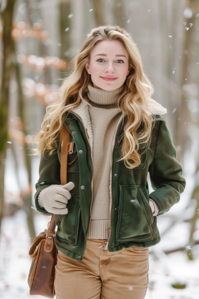 This outfit is a love letter to winter walks in the woods, featuring a deep green fleece jacket with a shearling-lined hood for that extra cozy touch. A beige turtleneck sweater pairs beautifully with camel-colored corduroy pants, creating a warm, earthy palette. Knit gloves and a classic brown leather crossbody bag complete the look, blending practicality with timeless charm.