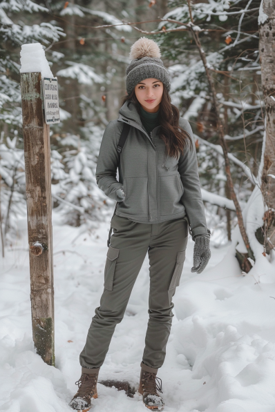 This outfit is built for snowy trail treks with its perfectly coordinated shades of gray. A fitted zip-up fleece jacket keeps things warm and lightweight, paired with durable cargo-style pants designed for both comfort and function. The knit pom-pom beanie adds a playful yet practical touch, while sturdy lace-up boots and cozy gloves round out the ensemble, ensuring you’re ready for any outdoor adventure.