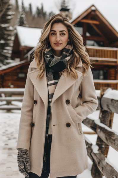 This outfit exudes understated elegance with a tailored beige double-breasted coat that’s perfect for chilly mountain getaways. Underneath, a plaid scarf in neutral tones adds a classic yet cozy touch, while dark skinny jeans create a streamlined silhouette. The textured knit gloves not only keep hands warm but also add a charming, rustic detail, making this look ideal for a snowy stroll or cabin-side photos.