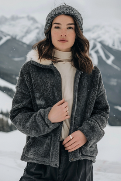 This outfit is the epitome of snug mountain chic, featuring a plush charcoal fleece jacket that promises warmth without compromising on style. A cream turtleneck peeks out for a soft contrast, while sleek black leather-like pants bring a touch of edgy sophistication. The look is perfectly tied together with a textured gray knit beanie, creating a harmonious balance of comfort and elegance.