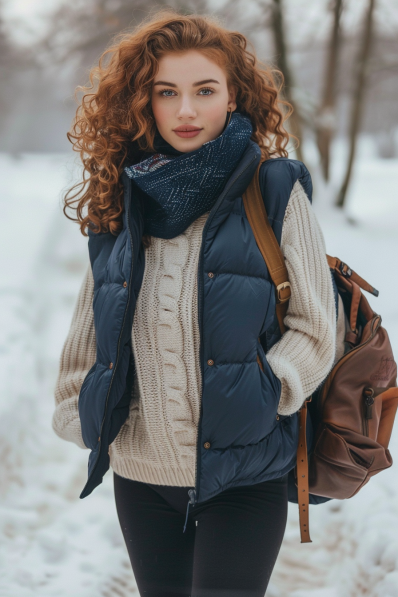 This outfit is a perfect mix of casual comfort and winter practicality, featuring a navy puffer vest that keeps things lightweight while still cozy. Layered over a chunky cream cable-knit sweater, it exudes a warm and inviting vibe. The dark leggings add a sleek touch, while the deep navy scarf ties the look together with a pop of pattern. A classic brown leather backpack is the cherry on top, combining style and functionality for all your mountain essentials.