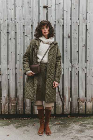 This outfit blends textures and tones effortlessly, starting with a long olive green quilted coat that’s both cozy and chic. A chunky white turtleneck sweater underneath adds a touch of brightness and softness to the earthy palette. The layered olive knit skirt paired with beige leggings brings a unique, fashion-forward twist, while the knee-high brown suede boots ground the look with rustic sophistication. A simple crossbody bag in a muted tone ties it all together for a polished, practical finish.