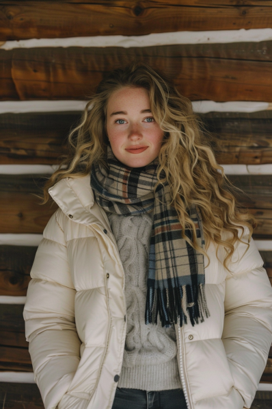 This outfit brings winter coziness to the forefront with a creamy white puffer jacket that’s as warm as it is stylish. Beneath the jacket, a chunky gray knit sweater adds texture and that snug, fireside vibe we all adore. The plaid scarf ties everything together with a classic, timeless pattern, giving the outfit a slightly preppy touch. Paired with dark jeans, this look is perfect for casual mountain cabin strolls or impromptu snowball fights.