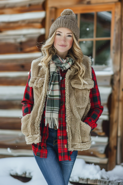 This outfit is the perfect blend of rustic charm and winter warmth, featuring a soft tan sherpa vest layered over a classic red-and-black plaid flannel shirt. A plaid scarf adds a touch of festive flair while keeping the look cohesive, and the fitted blue jeans provide a casual yet flattering base. Topped off with a cozy knit beanie in a warm tan shade, this ensemble is equal parts practical and adorable—perfect for mountain adventures or cabin lounging.